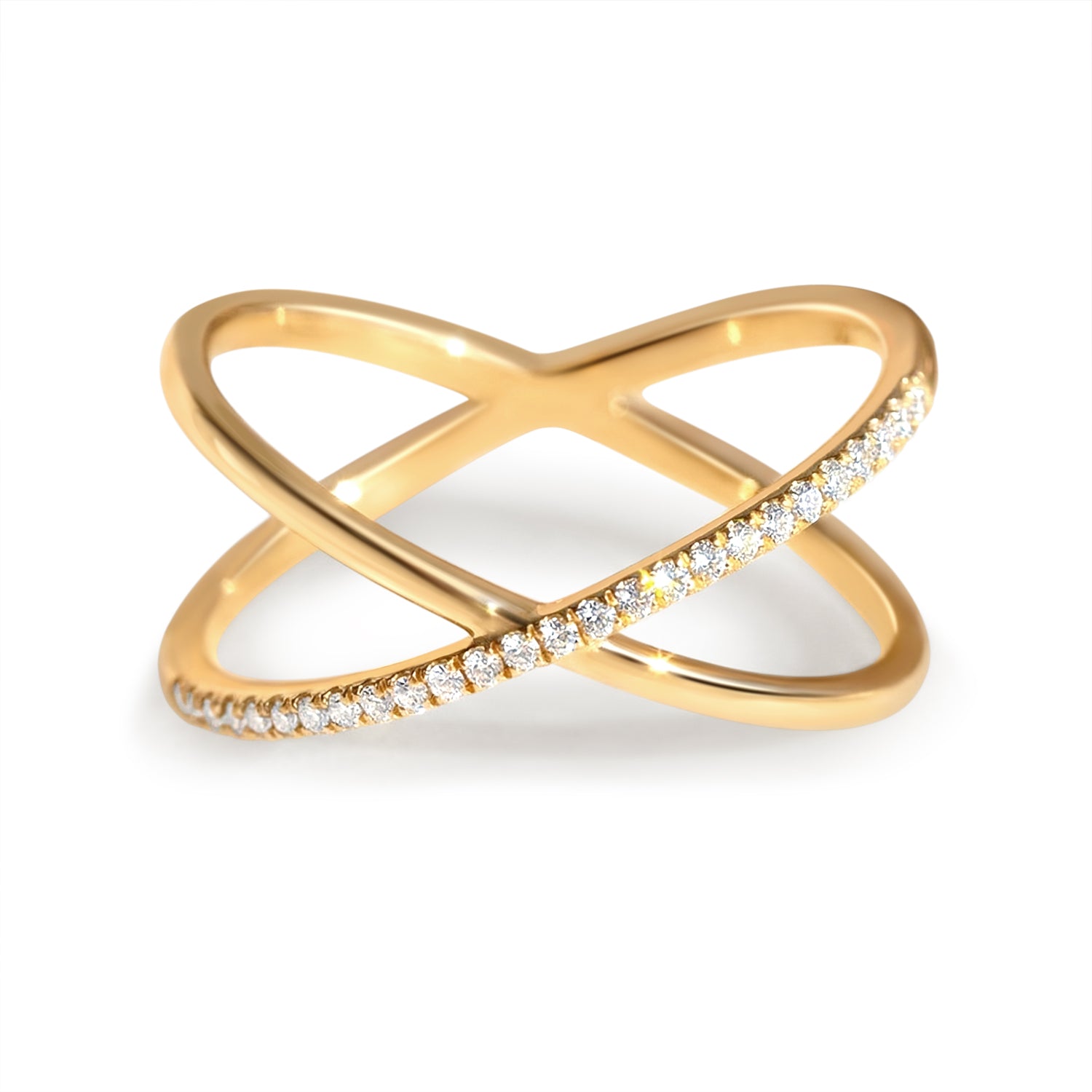 A sleek, modern crossover ring crafted in polished yellow gold, featuring two bands that wrap and intersect in a clean “X” silhouette. One arm is finished with a fine line of pavé-set lab-grown diamonds for subtle sparkle, while the other stays smooth and minimal for contrast. Lightweight, stack-friendly, and perfect as an everyday statement or a chic alternative wedding band.